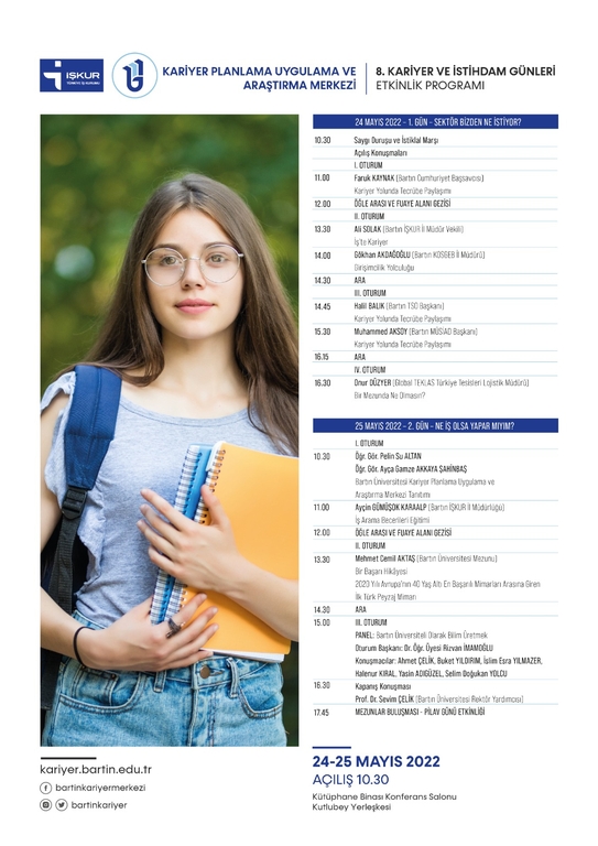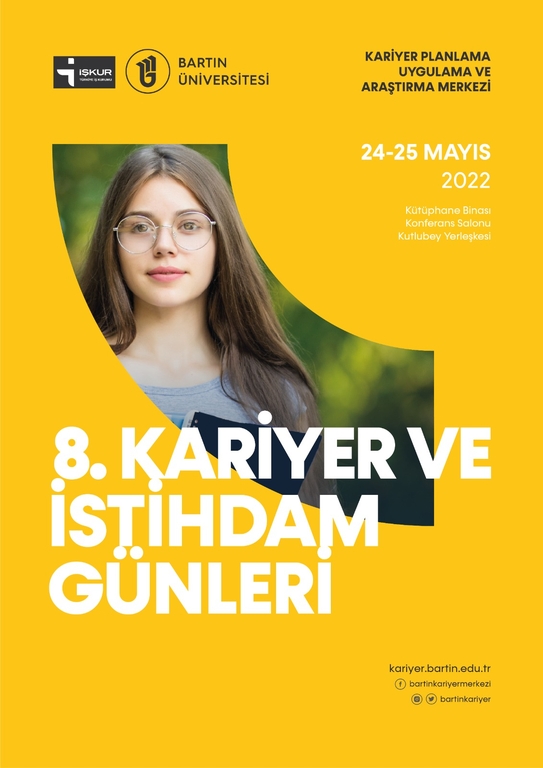 Kariyer Merkezimiz ile Çalışma ve İş Kurumu Bartın İl Müdürlüğü işbirliğiyle, 24-25 Mayıs 2022 tarihlerinde Üniversitemiz Kutlubey Kampüsü Kütüphane Binası Konferans Salonu'nda '8. Kariyer ve İstihdam Günleri' düzenlenecektir. Sizleri de Kariyer Günü etkinliğinde aramızda görmekten mutluluk duyacağımızı belirtmek isteriz.