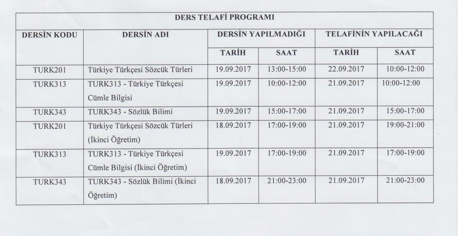 Prof. Dr. H. İbrahim DELİCE'nin Telafi Dersleri aşağıdaki tabloda belirtilmiştir.